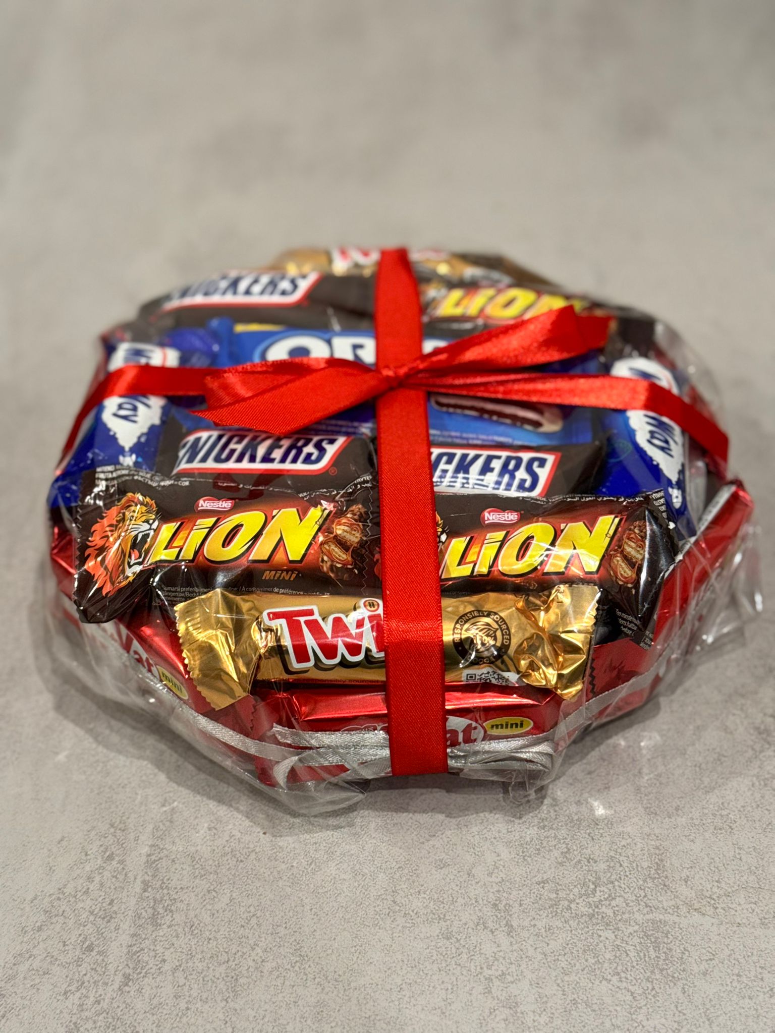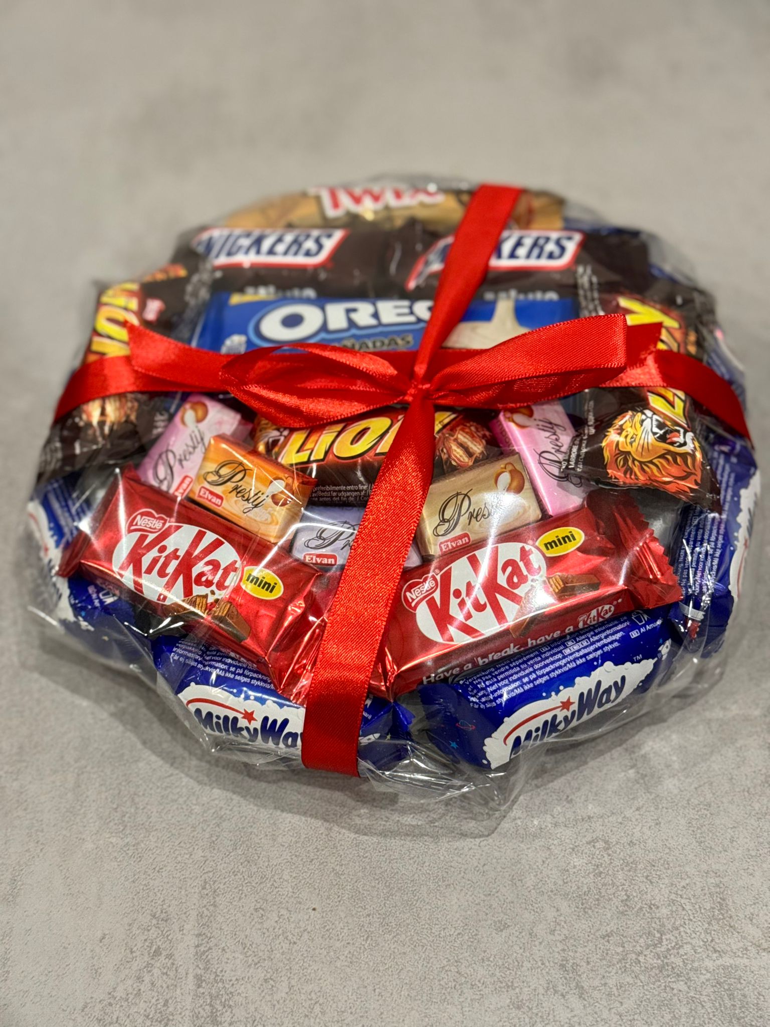 Regalo original compuesto por una selección de productos envasados de origen comercial, presentados en formato tarta y envueltos para regalo. 23 cm diámetro.